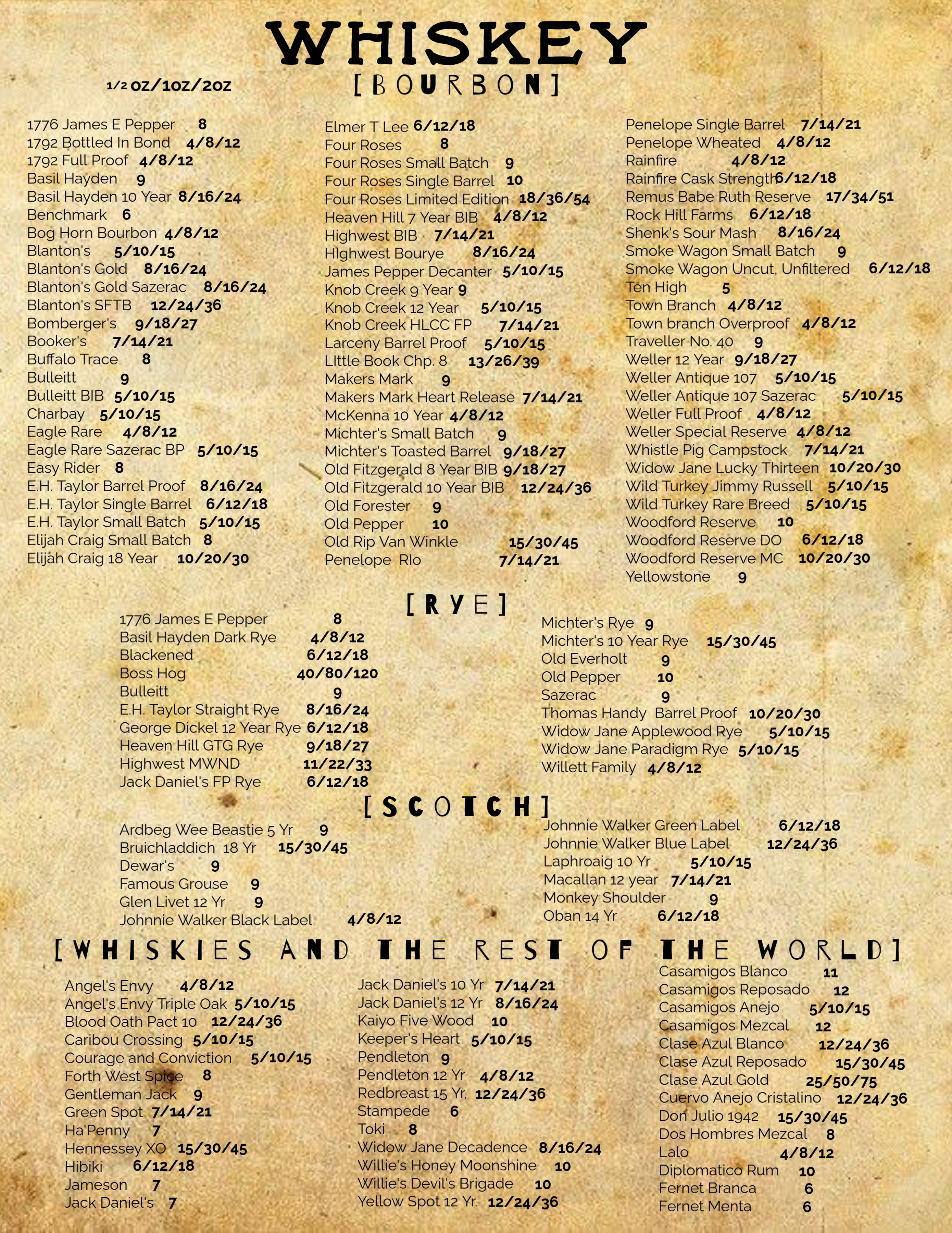 Current whiskey menu listed below but check with us in house for some that haven't made it on yet